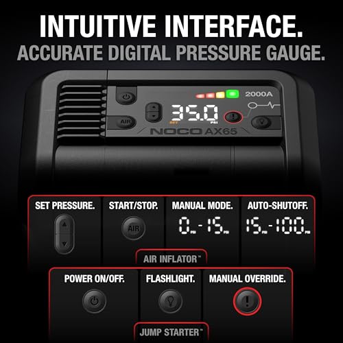 Specification: NOCO Boost Air AX65: 2000A Jump Starter with Air Compressor Tire Inflator – Starts 8.0L Gas & 6.0L Diesel – 67 SLPM Airflow Inflates 0–40 PSI in 2 Minutes